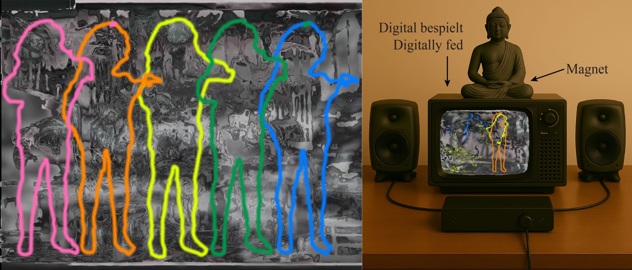 N. 37 (2025) Holistic notation study V {Neon facts for the moon}: Für Kathodenstrahlröhrenbildschirm, Statue, Magnet, Lautsprecher, Projektor und Laser | For cathode-ray tube screen, statue, magnet, loudspeakers, projector and laser [16-18’ + ∞].