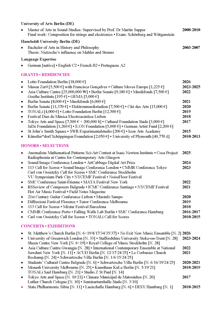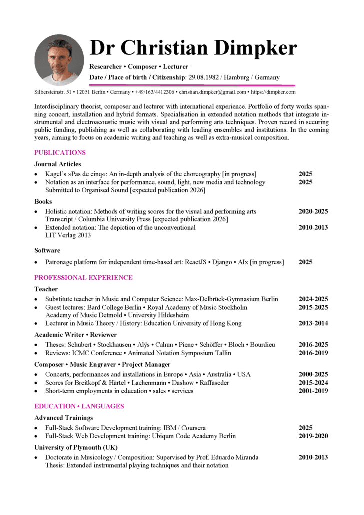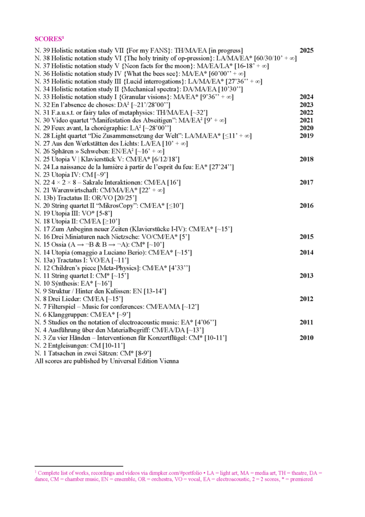 The art form I work in is notation. This means that all works are first constructed on paper and should be primarily accessed in this way. My whole œuvre is connected to the two treatises Extended Notation: The Depiction of the Unconventional (LIT publishers, 2013) and Holistic Notation: Methods of Writing Scores for the Visual and Performing Arts (due to be published in 2026 by Transcript / Columbia University Press) that develop notational methods for unconventional artistic events, including extended instrumental playing / singing techniques, electroacoustic music, light art, new media art, theatre and dance.
